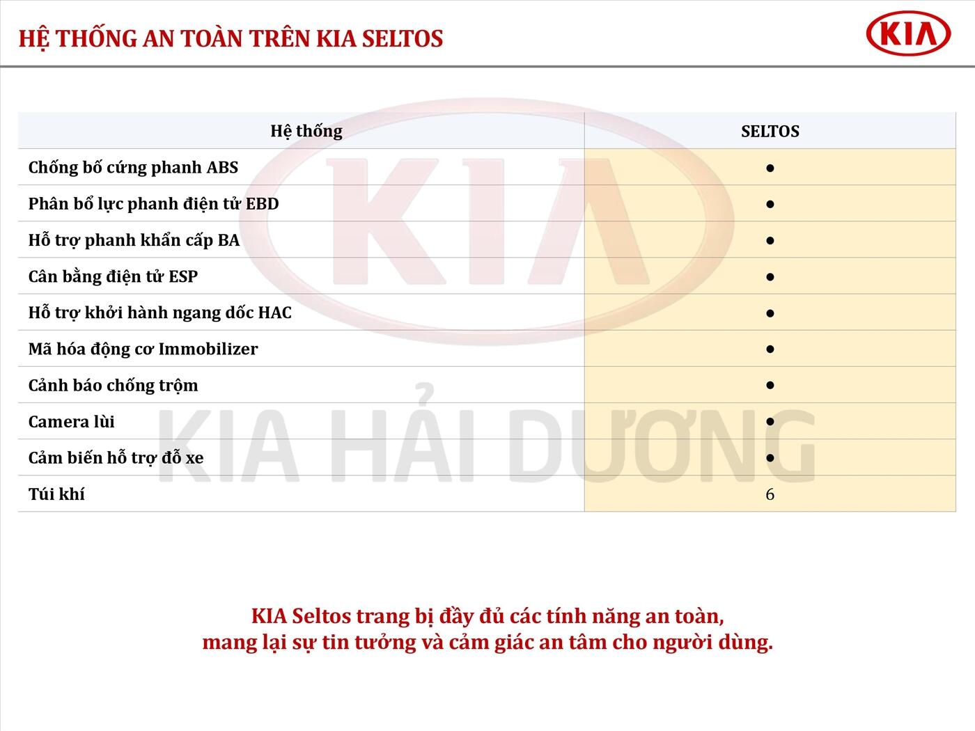 Trang bị an toàn trên Kia Seltos được xem là điểm sáng trong phân khúc SUV hạng B với đầy đủ những hỗ trợ như phanh (ABS, EBD, BA), cân bằng điện tử, kiểm soát thân xe. Cùng với đó, xe còn có trang bị hỗ trợ khởi hành ngang dốc, camera lùi, cảm biến lùi và 6 túi khí. Đặc biệt, Kia Seltos cũng là mẫu xe duy nhất trong phân khúc có 3 chế độ kiểm soát lực kéo.