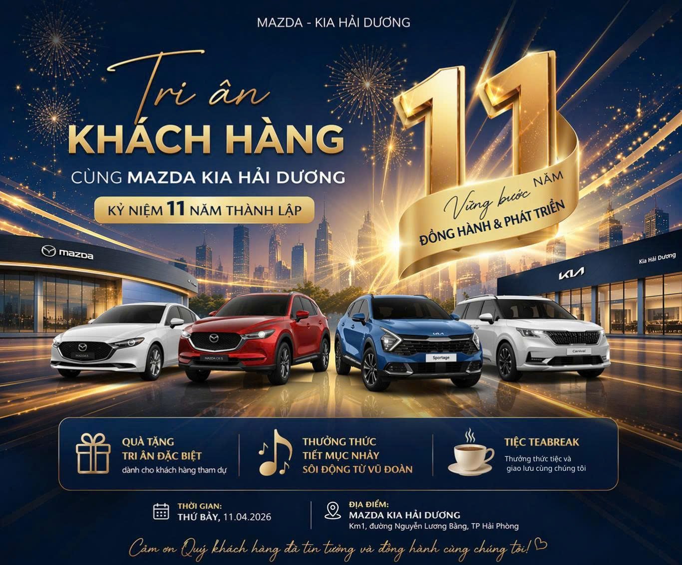 Kính mời Quý khách cùng đến tham dự và lưu giữ những khoảnh khắc ý nghĩa trong cột mốc 11 năm đáng nhớ cùng Mazda Kia Hải Dương.